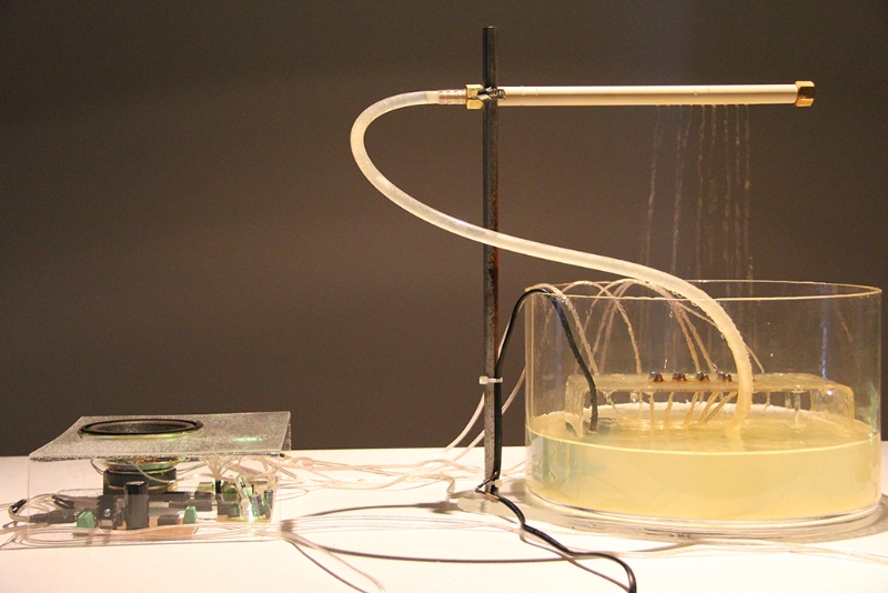 Es una instalación objetual donde se pone en relación el agua y la electricidad a través del sonido. Aludiendo a un ambiente de laboratorio en funcionamiento permanente. En esta obra el agua es un componente fundamental que se configura como resistencia variable dentro de los circuitos electrónicos de la obra, lo que nos permite reflexionar sobre su materialidad física y sonora como también sobre sus propiedades químicas.